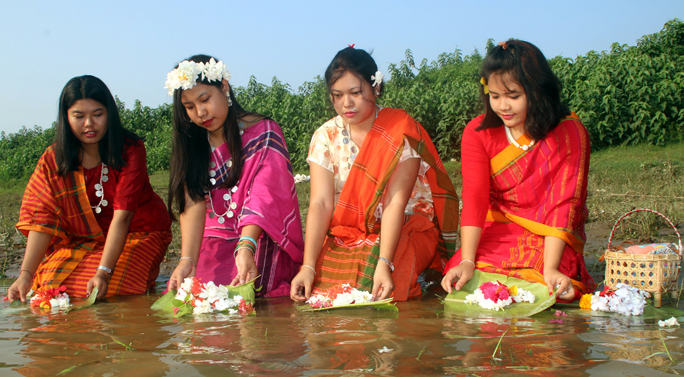 কলাপাতায় করে নানা রঙের ফুল দিয়ে পুরনো বছরের গ্লানি ভুলে নতুন বছরের শুভ কামনা। ছবিটি-খাগড়াছড়ি জেলা সদরের বটতলী এলাকায় চেঙ্গী নদী থেকে তোলা।[/caption]