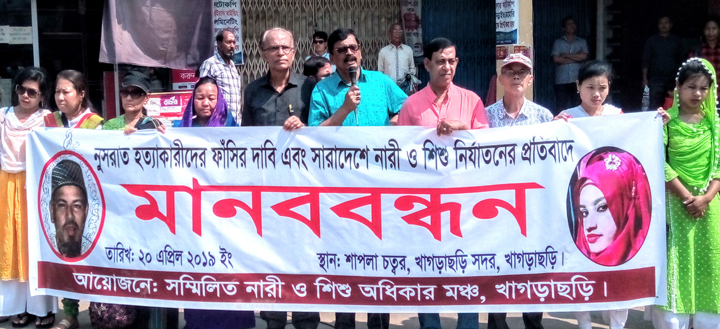 খাগড়াছড়ি : ফেনীর সোনাগাজীতে মাদ্রাসাছাত্রী নুসরাত জাহান রাফির হত্যাকারীদের ফাঁসির দাবিতে খাগড়াছড়িতে মানববন্ধন করেছে সামাজিক সংগঠন সম্মিলিত নারী ও শিশু অধিকার মঞ্চ।