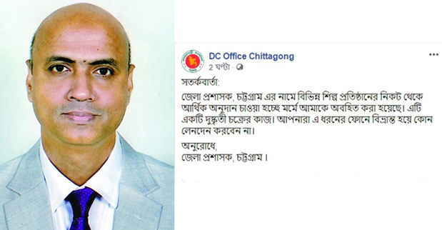 ‘জেলা প্রশাসক, চট্টগ্রামের নামে বিভিন্ন শিল্পপ্রতিষ্ঠানের কাছ থেকে আর্থিক অনুদান চাওয়া হচ্ছে মর্মে আমাকে অবহিত করা হয়েছে। এটি একটি দুষ্কৃতি চক্রের কাজ। আপনারা এ ধরনের ফোনে বিভ্রান্ত হয়ে কোনো লেনদেন করবেন না।'