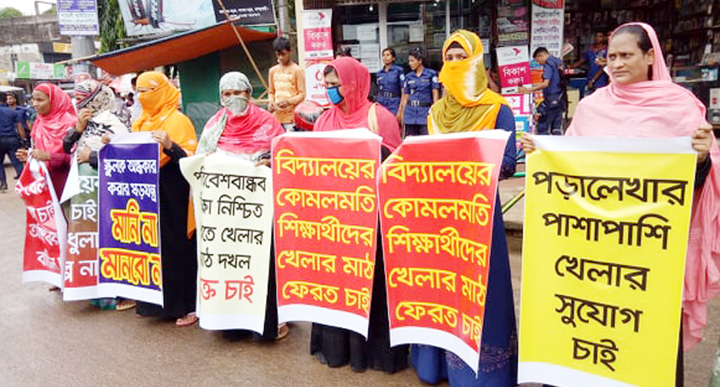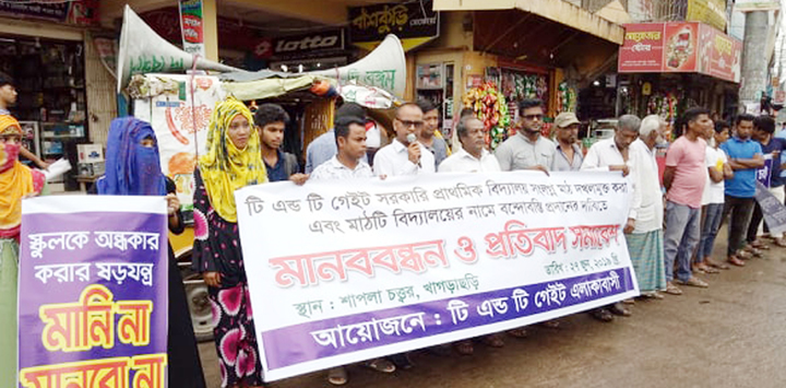 [caption id="attachment_42587" align="aligncenter" width="720"] স্কুল মাঠে ভবন নির্মাণ : প্রতিবাদে মানববন্ধন ও সমাবেশ[/caption]