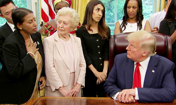 ধর্মীয় নিপীড়নের শিকার হওয়া বিশ্বের বিভিন্ন দেশের ২৭ জন নারী-পুরুষ মার্কিন প্রেসিডেন্ট ডোনাল্ড ট্রাম্পের সঙ্গে সাক্ষাৎ করেছেন। সংখ্যালঘুদের বিপদে পাশে দাঁড়ানোর জন্য তারা ট্রাম্পের কাছে কৃতজ্ঞতা জানান। একইসঙ্গে পেশ করেন নিজেদের অভাব-অভিযোগ। এসময় নিজেকে বাংলাদেশি পরিচয় দিয়ে এক নারী ট্রাম্পকে জানিয়েছেন, তার ঘরবাড়ি পুড়িয়ে দেওয়া হয়েছে। জমি ছিনিয়ে নেওয়া হয়েছে। কিন্তু তিনি আইনের সুরক্ষা পাননি।