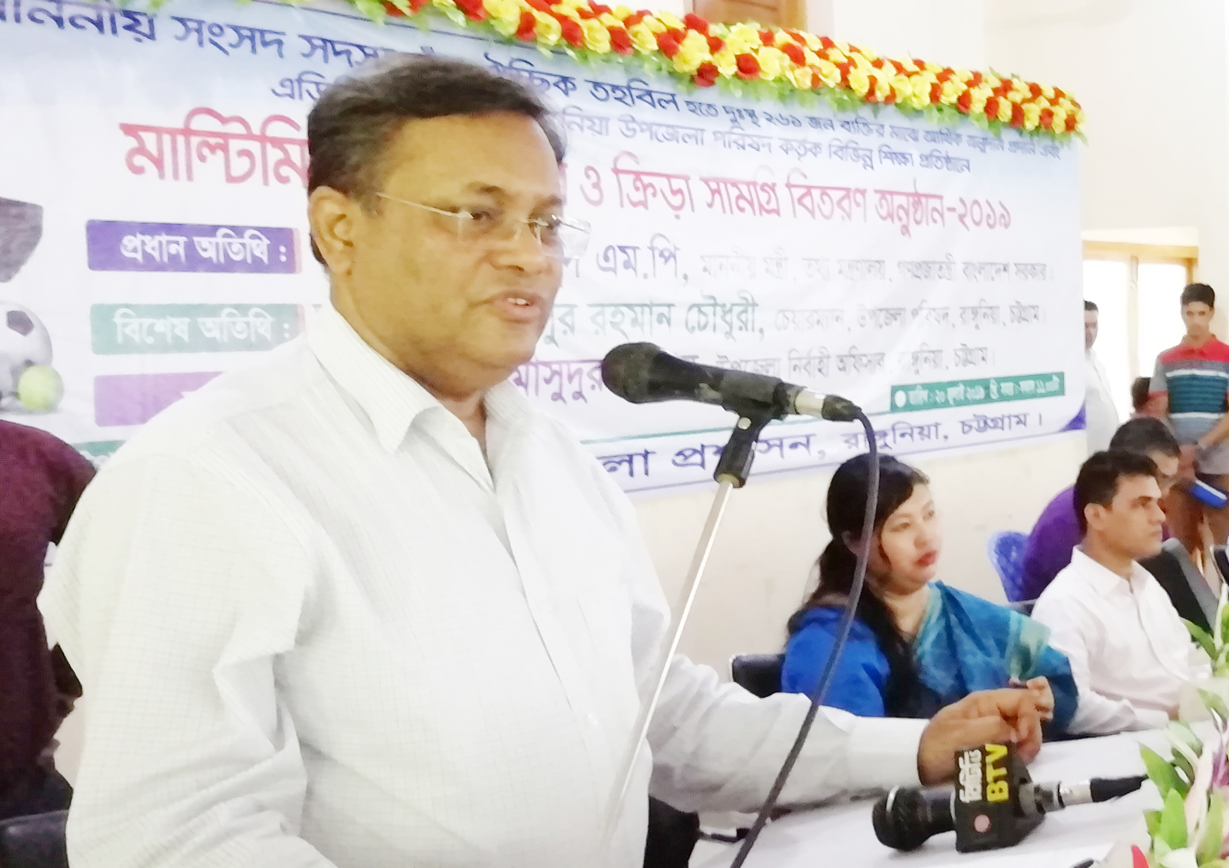 রাঙ্গুনিয়ায় ঐচ্ছিক তহবিলের আর্থিক অনুদান প্রদান অনুষ্টানে প্রধান অতিথির বক্তব্য রাখছেন তথ্যমন্ত্রী ড. হাছান মাহমুদ।[/caption]