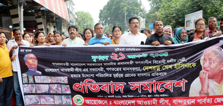 বান্দরবান : ২০০৪ সালের ২১ আগস্ট আওয়ামীলীগের সভানেত্রী এবং প্রধানমন্ত্রী শেখ হাসিনাকে হত্যার উদ্দেশ্যে বর্বোচিত গ্রেনেড হামলার প্রতিবাদে বান্দরবানে প্রতিবাদ সমাবেশ করেছে বান্দরবান জেলা আওয়ামীলীগ।