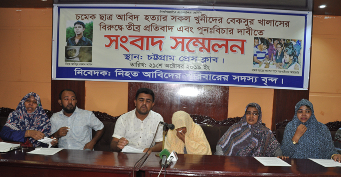 চমেক হাসাপাতালের মেধাবী ছাত্র আবিদ হত্যার সকল খুনিদের বেখসুর খালাসের প্রতিবাদ ও বিচারের দাবীতে সোমবার (২১ অক্টোবর) সকালে চট্টগ্রাম প্রেসক্লাবে সংবাদ সম্মেলনে কান্ন জড়িত কণ্ঠে এই দাবী জানান নিহত আবিদের মা মোসাম্মদ সৈয়দুর নেছা।
