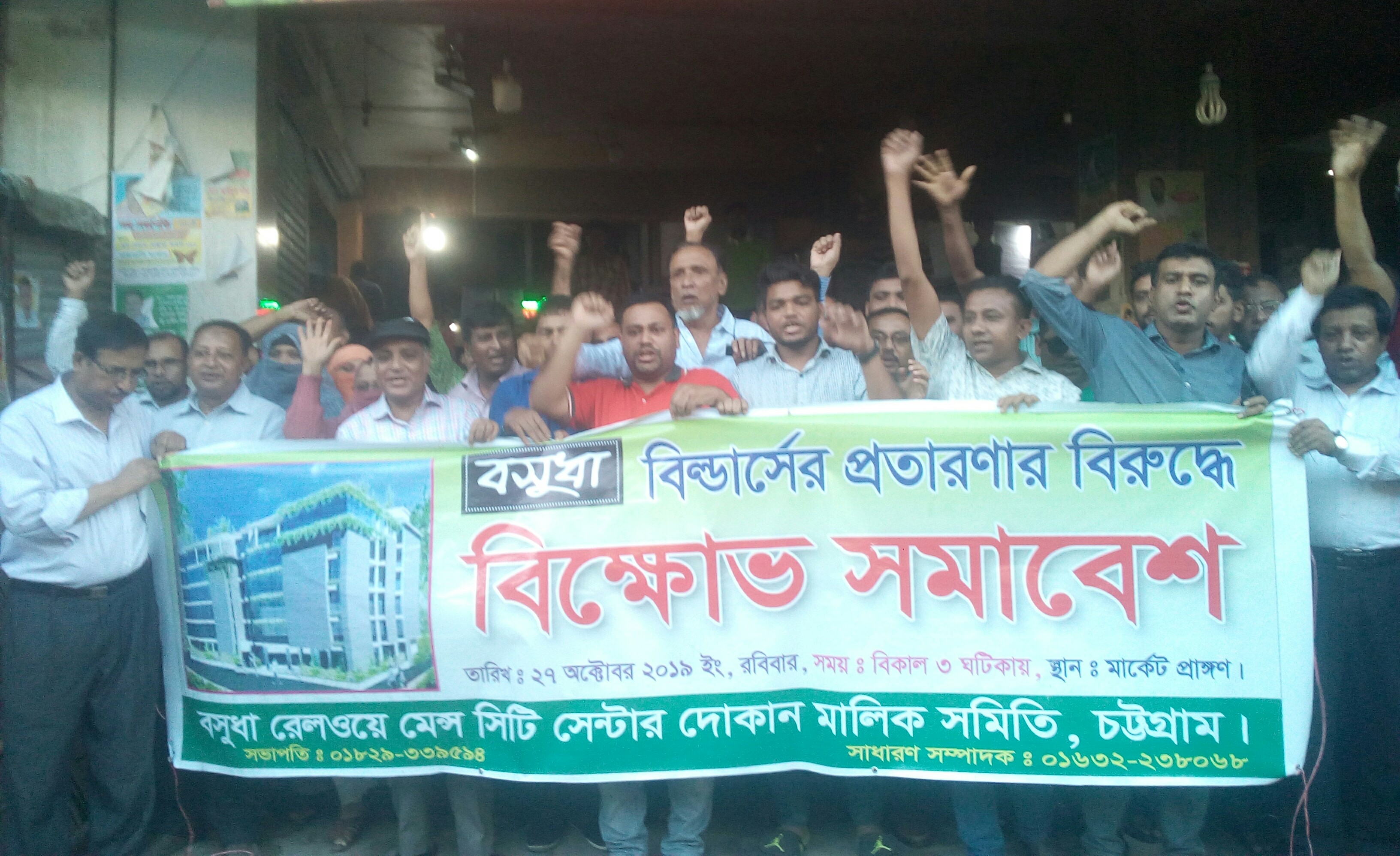 হাকিম মোল্লা : বসুধা বিল্ডার্সের মালিক জব্বারের প্রতারণায় চট্টগ্রাম নগরীর প্রায় ৫০০ দোকানের মালিক আজ দিশেহারা। অনেকে হতাশায় মৃত্যু বরণও করেছেন। কোটি কোটি টাকা হাতিয়ে নিয়ে পথে বসিয়েছে। এতে ক্ষোভ প্রকাশ করে বিক্ষোভ সমাবেশ ও মিছিল করেছে বসুধা রেলওয়ে মেন্স সিটি সেন্টার দোকান মালিক সমিতি।