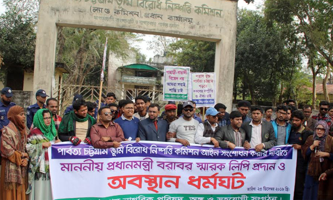 পার্বত্য চট্টগ্রাম ভূমি বিরোধ নিষ্পত্তি কমিশন আইন ২০০১ ও সংশোধনী আইন ২০১৬ এর অধীনে শুনানী বন্ধের দাবিতে খাগড়াছড়িতে ভূমি কমিশন কার্যালয় ঘেরাও করে বিক্ষোভ করেছে পার্বত্য চট্টগ্রাম নাগরিক পরিষদ।