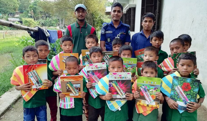 খুদে শিক্ষার্থীদের মাঝে বই নিয়ে হাজির মানবতার ফেরিওয়ালা পুলিশ সদস্য মেহেদি হাসান দোলন।[/caption]