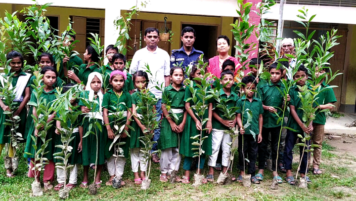 খুদে শিক্ষার্থীদের মাঝে গাছের চারা নিয়ে হাজির মানবতার ফেরিওয়ালা পুলিশ সদস্য মেহেদি হাসান দোলন।[/caption]