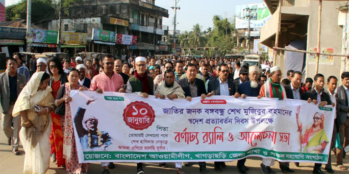 খাগড়াছড়িতে বঙ্গবন্ধু শেখ মুজিবুর রহমানের স্বদেশ প্রত্যাবর্তন দিবস ও জাতির জনকের জন্মশতবার্ষিকী উপলক্ষে জেলা আওয়ামী লীগের বর্ণাঢ্য আয়োজন করা হয়েছে।