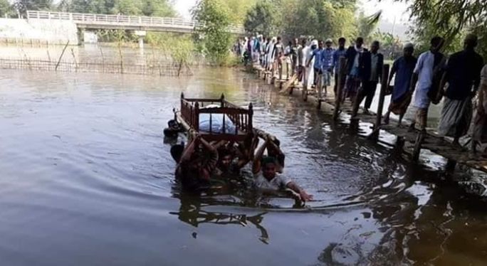 গ্রামবাসী সূত্রে জানা গেছে, শনিবার বাইশারী ইউনিয়নের হরিণ খাইয়া গ্রামের মৃত্যু আকবর আহমেদ এর পুত্র বীর মুক্তিযোদ্ধা মোজাফফর আহমদ প্রকাশ মুজারু (৭৮) ইন্তেকাল করেন। জানাযা ও দাফন করার লক্ষ্যে হরিণ খাইয়া গ্রামের পার্শ্ববর্তী গর্জনিয়া ইউনিয়নের শিয়া পাড়া জামে মসজিদে কেউ কেউ বাঁশের তৈরি ঝুঁকিপূর্ণ সাঁকো দিয়ে পার হয়। তবে বেশির ভাগ গ্রামবাসীকে পার হতে হয় কোমর পর্যন্ত পানিতে ভিজে। আর লাশ নিয়ে যাওয়া হয়েছে হাতের উপর ভর করে ভাসিয়ে।