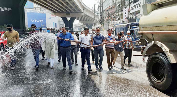 চসিক মেয়রের উদ্যোগে সড়কে ছিটানো হচ্ছে ব্লিচিং পাউডার মেশানো পানি।[/caption]