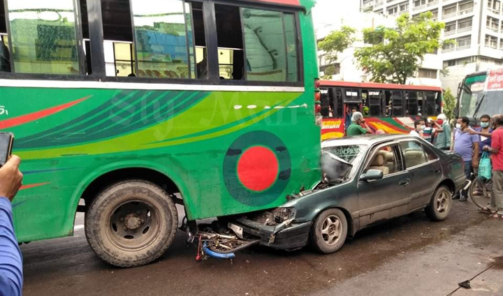 ঘটনার প্রত্যক্ষদর্শী সুমন চৌধুরী জানান, প্রাইভেট কারটি হঠাৎ করে এসে তার সামনের সাইকেলকে ধাক্কা দিলে ওই সাইকেল আরোহীসহ যাত্রীবাহি বাসের নিচের ঢুকে যায়। এতে সাইকেল আরোহী এবং কারের চালক কিছুটা আঘ্রাতপ্রাপ্ত হন। তবে প্রাণহানির ঘটনা থেকে আল্লাহ রক্ষা করেছেন। এসময়ে যানজটে যাত্রীসাধারণ আর পথচারীদের দুর্ভোগ সৃষ্টি হয়। পরে পুলিশের সহায়তায় যানজট নিরসন হয় বলে জানিয়েছেন একাধিক প্রত্যক্ষদর্শী।