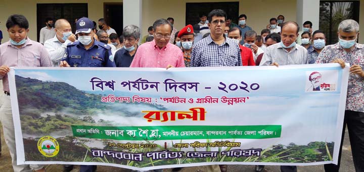 বান্দরবান : পর্যটন ও গ্রামীন উন্নয়ন_এই প্রতিপাদ্যকে সামনে রেখে বর্ণাঢ্য আয়োজনে বান্দরবানে উদযাপিত হয়েছে বিশ্ব পর্যটন দিবস। এ উপলক্ষে রবিবার (২৭ সেপ্টেম্বর) সকালে বান্দরবান পার্বত্য জেলা পরিষদের আয়োজনে পার্বত্য জেলা পরিষদের প্রাঙ্গণ হতে একটি শোভাযাত্রা বের হয়ে বিভিন্ন গুরুত্বপূর্ণ সড়ক প্রদক্ষিণশেষে পরিষদের অডিটরিয়ামে এসে সমবেত হয়।