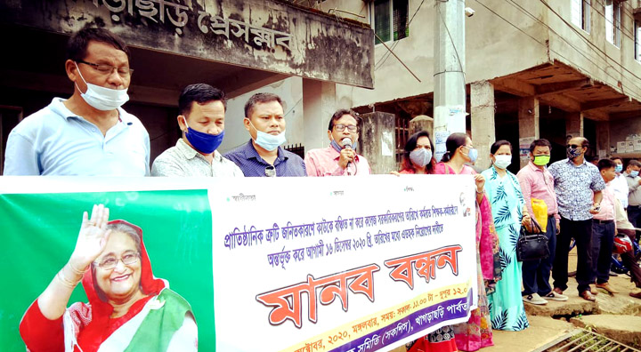 বাংলাদেশ সরকারি কলেজ শিক্ষক সমিতি (সকশিস) খাগড়াছড়ি জেলা শাখার উদ্যোগে মঙ্গলবার (২০ অক্টোবর) সকালে খাগড়াছড়ি প্রেস ক্লাবের সামনে এক মানববন্ধন ও জেলা প্রশাসকের মাধ্যমে প্রধানমন্ত্রী বরাবরে স্মারকলিপি প্রদানের মাধ্যমে এ দাবি করা হয়।