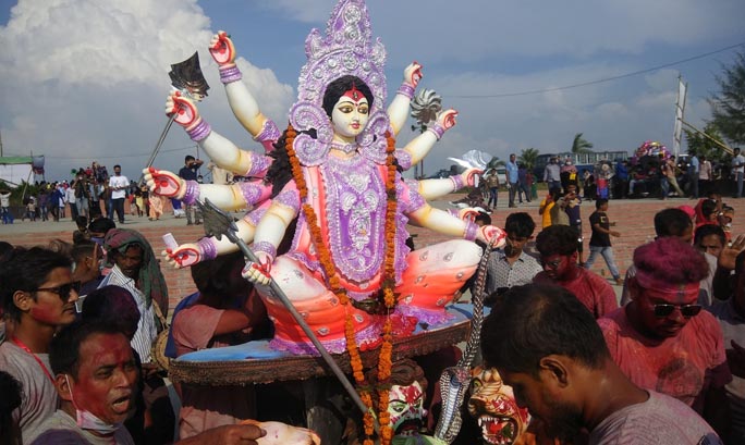 চট্টগ্রাম নগরীর পতেঙ্গা সমুদ্র সৈকত সংলগ্ন সমুদ্রে রিকশাভ্যান, ট্রাক, পিকআপযোগে নগরের বিভিন্ন স্থান থেকে প্রতিমা সহকারে মিছিল একে একে এসে বিসর্জন দিতে দেখা যায়। সোমবার (২৬ অক্টোবর) দুপুর সাড়ে ১২টা থেকে সমুদ্র সৈকতে শুরু হয় একে একে প্রতিমা বিসর্জন।