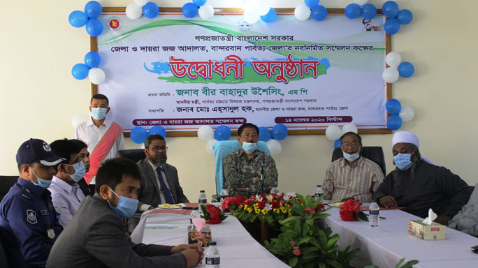 পরে জেলা ও দায়রা জজ আদালতের সভাকক্ষে এক উদ্বোধনী সভা অনুষ্ঠিত হয়। এসময় বান্দরবান জেলা ও দায়রা জজ মোঃ এহসানুল হকের সভাপতিত্বে অনুষ্ঠানে প্রধান অতিথি হিসেবে উপস্থিত ছিলেন পার্বত্য চট্টগ্রাম বিষয়ক মন্ত্রণালয়ের মন্ত্রী বীর বাহাদুর উশৈসিং এমপি।