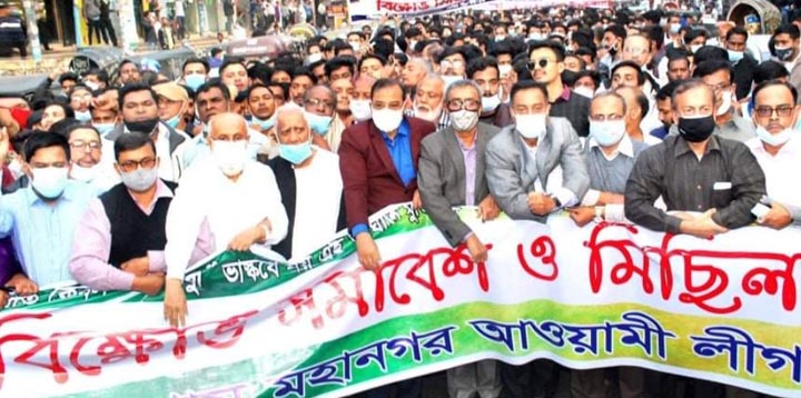 মহানগর আওয়ামীলীগের উদ্যোগে আয়োজিত বিক্ষোভ সমাবেশে সংগঠনের ৪৩টি সাংগঠনিক ওয়ার্ডসহ অঙ্গ ও সহযোগী সংগঠনের নেতাকর্মীদের স্ব স্ব সংগঠনের ব্যানার নিয়ে অংশগ্রহণ করে।