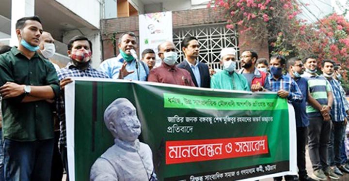 জাতির জনক বঙ্গবন্ধু শেখ মুজিবুর রহমানের ভাস্কর্য ভাঙার প্রতিবাদে বুধবার (৯ ডিসেম্বর) দুপুরে চট্টগ্রাম প্রেসক্লাব চত্বরে বিক্ষুব্ধ সাংবাদিক সমাজ ও গণমাধ্যমকর্মী, চট্টগ্রামের ব্যানারে আয়োজিত মানববন্ধন ও সমাবেশ থেকে এ দাবী জানানো হয়েছে।