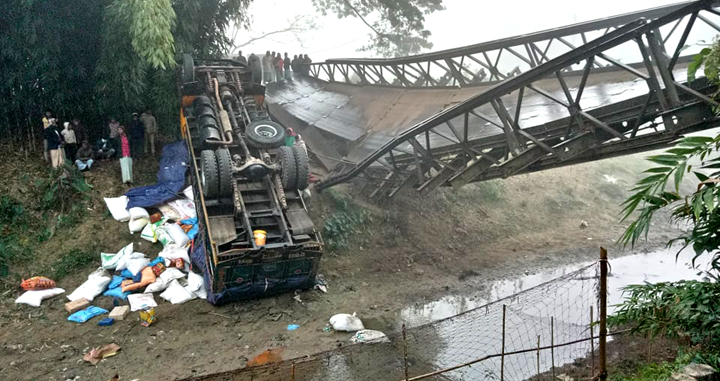 মঙ্গলবার (২২ ডিসেম্বর) ভোর সাড়ে ৪টায় ১১বিজিবি ব্যাটালিয়ন সংলগ্ন নাইক্ষ্যংছড়ি-রামুর গর্জনিয়া সীমান্ত বেইলী ব্রীজটি ভেঙ্গে এ দূর্ঘটনা ঘটে। মুদি দোকানের বিভিন্ন মালামাল বুঝাই ট্রাকটি খালে পড়ে গেলেও এ ঘটনায় কেউ হতাহত হয়নি। তাৎক্ষণিকভাবে পরিচয় মিলেনি ট্রাক চালকের। বর্তমানে নাইক্ষ্যংছড়ি-রামু সড়কে যানবাহন চলাচল বন্ধ রয়েছে।