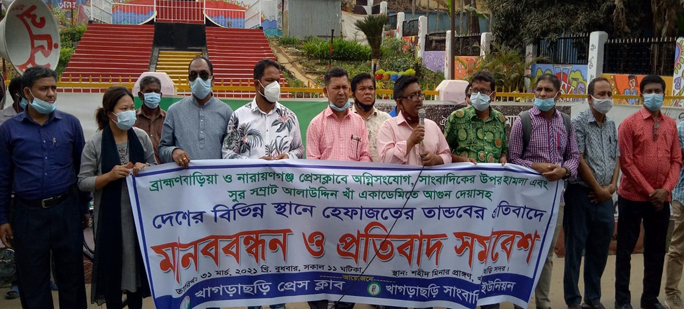 খাগড়াছড়ি : ব্রাহ্মণবাড়িয়া ও নারায়ণগঞ্জ প্রেসক্লাবে অগ্নিসংযোগ, সাংবাদিকদের উপর হামলা ও সুর সম্রাট আলাউদ্দিন খাঁ একাডেমিতে আগুন দেয়া এবং সরকারি-বেসরকারি স্থাপনা ভাঙচুর, রাষ্ট্রীয় সম্পদ ক্ষতিসহ দেশের বিভিন্নস্থানে হেফাজতের তান্ডবের প্রতিবাদে খাগড়াছড়িতে মানববন্ধন ও প্রতিবাদ সমাবেশ করেছেন সাংবাদিকরা।