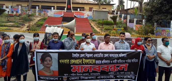 একই সময়, খাগড়াছড়ি জেলা শিল্পকলা একাডেমির উদ্যোগে, টাঙ্গাইল জেলা শিল্পকলা একাডেমির জেলা কালচারাল অফিসার খন্দকার রেদওয়ানা ইসলামকে হত্যার প্রতিবাদে ও দায়ী ব্যক্তিদের শাস্তির দাবিতে মানববন্ধন করেছে, জেলার সাংস্কৃতিক কর্মীরা। এতে জেলার সাংস্কৃতিক কর্মীদের পাশাপাশি বিভিন্ন পেশাজীবী ও সাংবাদিকরা সংহতি প্রকাশ করে বক্তব্য রাখেন।
