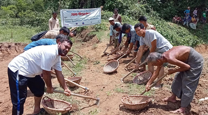 [caption id="attachment_73026" align="aligncenter" width="720"] পাহাড়ি এলাকায় পানির অভাব পূরণ ও মাছ চাষের আগ্রহ সৃষ্টির লক্ষে পতিত জায়গায় গোধা বাঁধ নির্মাণ কাজের উদ্বোধন করছেন প্রকল্পের মাঠ কর্মকর্তা মামুন সিকদার। -লামা প্রতিনিধি।[/caption]