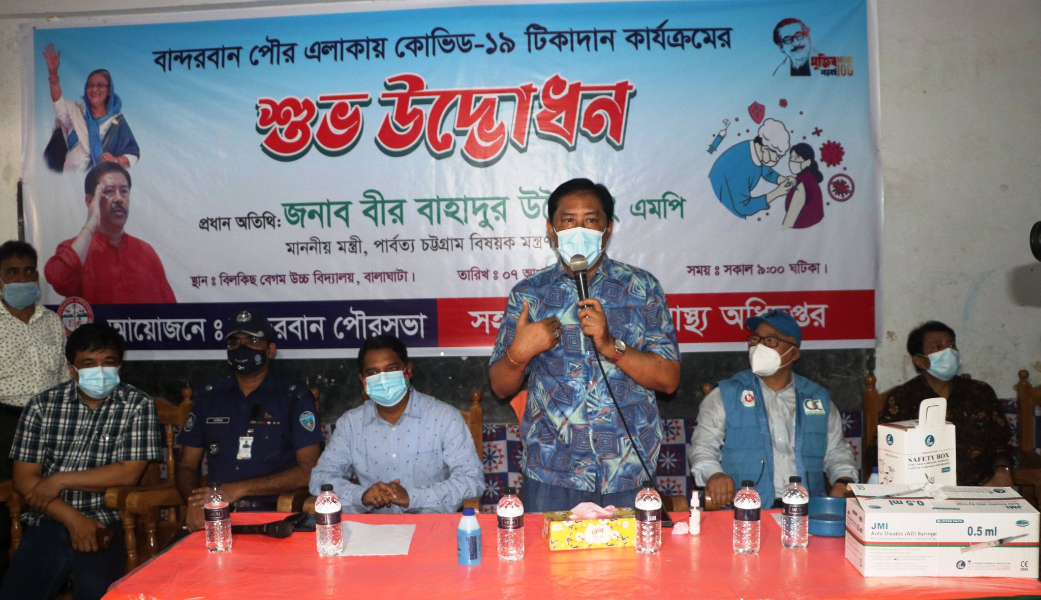 উদ্বোধনী অনুষ্ঠানে প্রধান অতিথির বক্তব্যে পার্বত্যমন্ত্রী বীর বাহাদুর উশৈসিং এমপি বলেন, বর্তমান প্রধানমন্ত্রী জননেত্রী শেখ হাসিনার আন্তরিকতার কারণে আজ বাংলাদেশের প্রতিটি পৌরসভা ও ইউনিয়ন পর্যায়েও করোনার ভ্যাকসিন পাচ্ছে সাধারণ জনগণ। এসময় পার্বত্যমন্ত্রী বীর বাহাদুর উশৈসিং সবাইকে করোনা ভ্যাকসিন গ্রহণের পাশাপাশি স্বাস্থ্যবিধি মেনে জীবনযাপন করার অনুরোধ জানান।