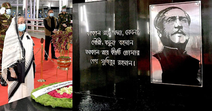 বঙ্গবন্ধুর প্রতিকৃতিতে পুষ্পস্তবক অর্পণের পর কিছুক্ষণ নিরবে দাঁড়িয়ে থাকেন প্রধানমন্ত্রী। এ সময় বিউগলে বাজানো হয় করুণ সুর।