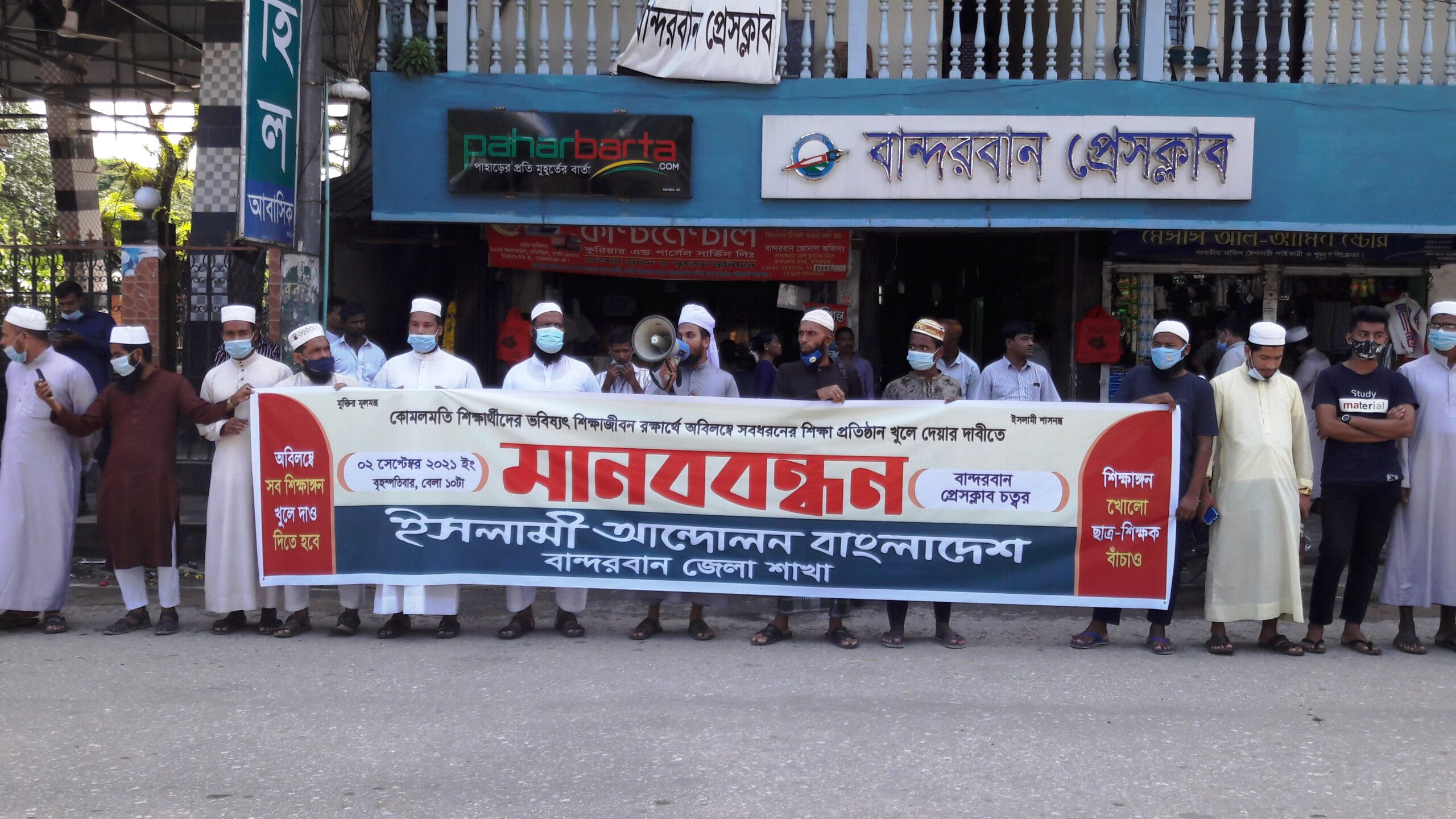 মানববন্ধনে ইসলামী আন্দোলন বাংলাদেশ বান্দরবান জেলা শাখার সাধারণ সম্পাদক মুফতী আবুল হাসান (রুমি), সাংগঠনিক সম্পাদক মাওলানা আহমদ কবির, জাতীয় শিক্ষক ফোরাম জেলা শাখার সভাপতি মাওলানা মুবাশ্বির বিন আজহার, জেলা ইসলামী শ্রমিক আন্দোলনের সভাপতি মো.নুরুল আলমসহ অন্যান্যরা উপস্থিত ছিলেন।