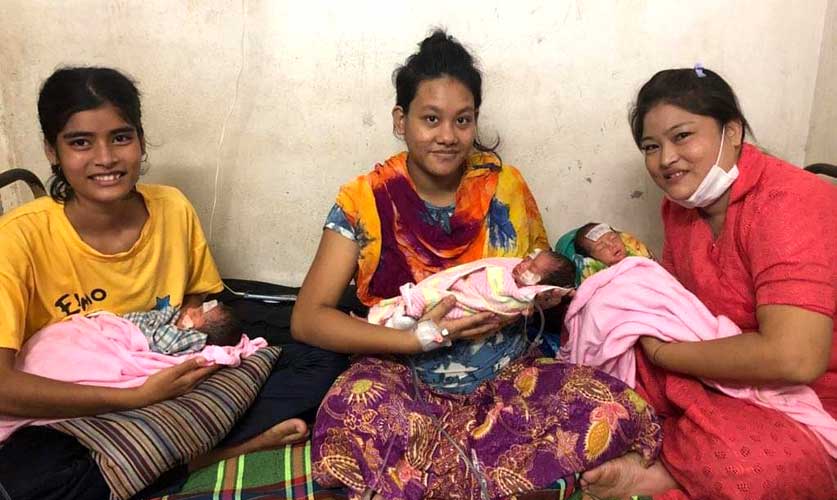 [caption id="attachment_77102" align="aligncenter" width="837"] চন্দ্রঘোনা খ্রীষ্টিয়ান হাসপাতালে একসঙ্গে জন্ম নেওয়া তিন নবজাতক কোলে মা (মাঝে) ও তাদের স্বজনরা[/caption]