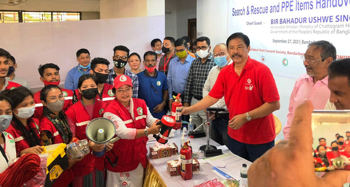 বান্দরবান : ইউএসএইড-এর অর্থায়নে সক্ষমতা প্রকল্পের মাধ্যমে বান্দরবানের ২ হাজার ১শ ৪৫জন স্বেচ্ছাসেবকের জন্য বাংলাদেশ রেড ক্রিসেন্ট সোসাইটির কাছে ব্যক্তিগত সুরক্ষা, অনুসন্ধান ও উদ্ধারের জন্য প্রয়োজনীয় সামগ্রী আনুষ্ঠানিকভাবে হস্তান্তর করা হয়েছে।