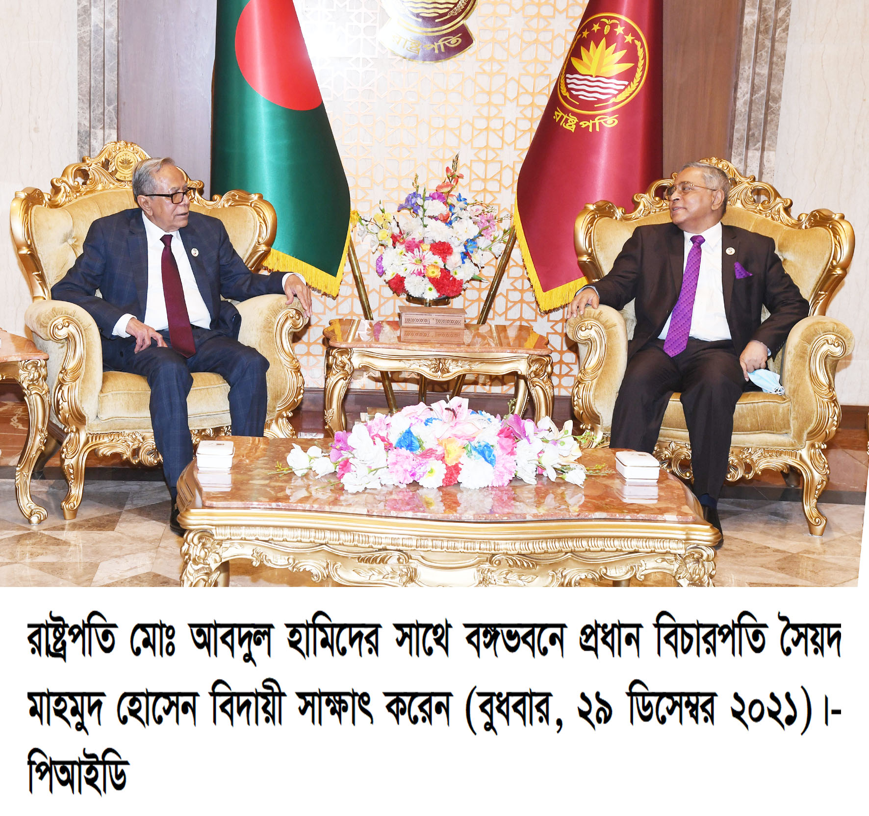 রাষ্ট্রপতি মােঃ আবদুল হামিদের সাথে প্রধান বিচারপতি সৈয়দ মাহমুদ হােসেন বিদায়ী সাক্ষাৎ করেছেন।