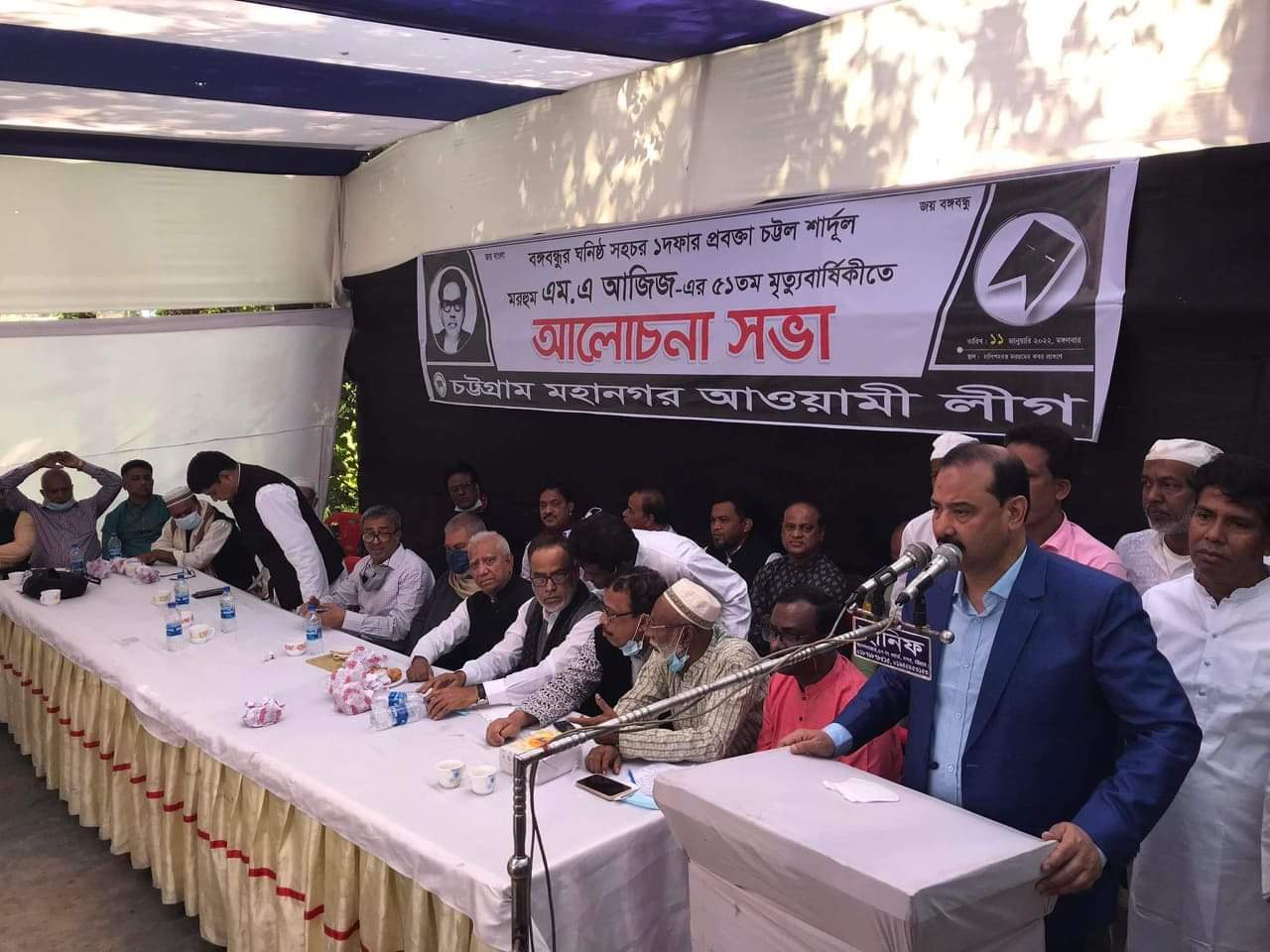 চট্টগ্রাম মহানগর আওয়ামী লীগের সহসভাপতি নঈম উদ্দিন চৌধুরীর সভাপতিত্ব ও সাংগঠনিক সম্পাদক হাসান মাহমুদ হাসনীর সঞ্চালনায় সভায় চসিক মেয়র এম রেজাউল করিম চৌধুরী, সহসভাপতি আলতাফ হোসেন চোধুরী বাচ্চু, উপদেষ্টা শফর আলী, সাংগঠনিক সম্পাদক নোমান আল মাহমুদ, মরহুম এ আজিজের সন্তান সাইফুদ্দিন খালেদ বাহার, মহানগর আওয়ামী লীগের প্রচার সম্পাদক শফিকুল ইসলাম ফারুক, ধর্ম সম্পাদক হাজী জহুর আহমদ, ত্রাণ ও সমাজ সম্পাদক মোহাম্মদ হোসেন প্রমুখ বক্তব্য রাখেন।