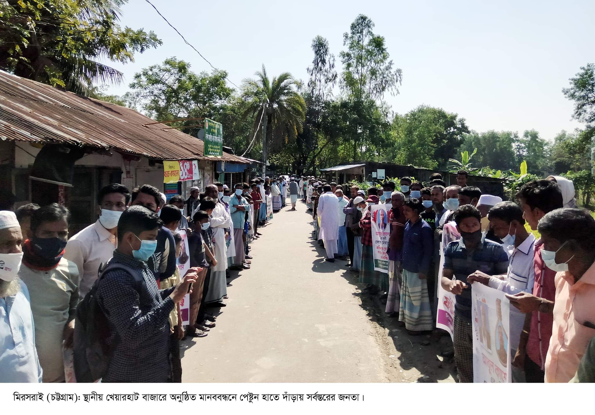 রবিবার (৬ ফেব্রুয়ারি) সকাল ১১টার নাগাদ উপজেলার শাহেরখালী ইউনিয়নের দক্ষিণ মঘাদিয়া গ্রামের খেয়ারহাট বাজারে অনুষ্ঠিত মানববন্ধনে অংশ নেয় ক্ষুদ্ধ এলাকাবাসী।