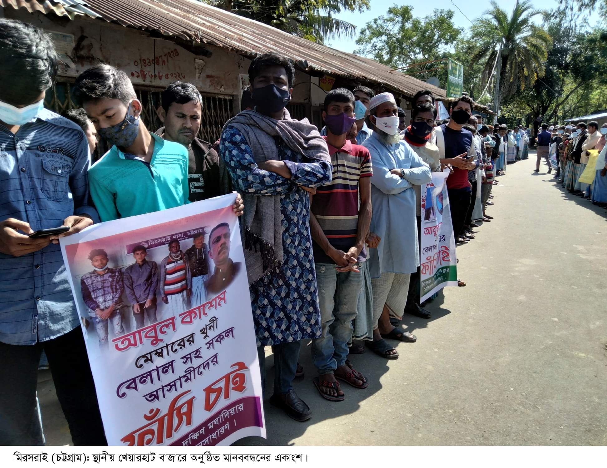 মিরসরাই (চট্টগ্রাম) প্রতিনিধি:চট্টগ্রামের মিরসরাইয়ে আলোচিত সাবেক ইউপি সদস্য আবুল কাশেম হত্যা মামলার প্রধান আসামীকে এখনো গ্রেপ্তার করতে পারেনি পুলিশ। এতে ক্ষুদ্ধ এলাকাবাসী প্রধান আসামী ইউপি সদস্য মো. বেলাল হোসেনকে গ্রেপ্তার এবং হত্যার সঙ্গে জড়িতদের দৃষ্টান্তমূলক শাস্তির দাবিতে মানববন্ধন করেছে নিহত কাশেমের পরিবার ও এলাকার লোকজন।