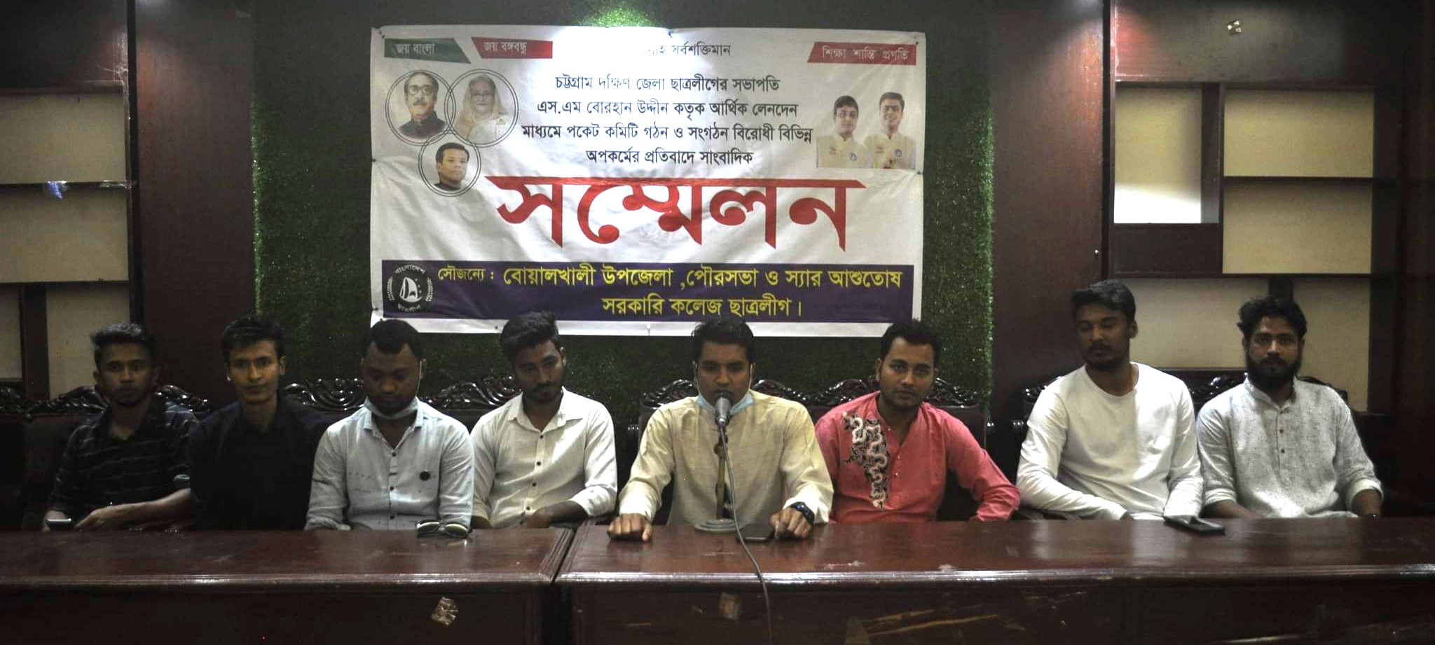 চট্টগ্রাম দক্ষিণ জেলা ছাত্রলীগের সভাপতি এস.এম.বােরহান উদ্দিন কর্তৃক আর্থিক লেনদেনের মাধ্যমে কমিটি গঠন ও সংগঠন বিরােধী অপকর্মের প্রতিবাদে বােয়ালখালী উপজেলা, পৌরসভা ও স্যার আশুতােষ সরকারি কলেজ ছাত্রলীগের সাংবাদিক সম্মেলন অনুষ্ঠিত হয়েছে।