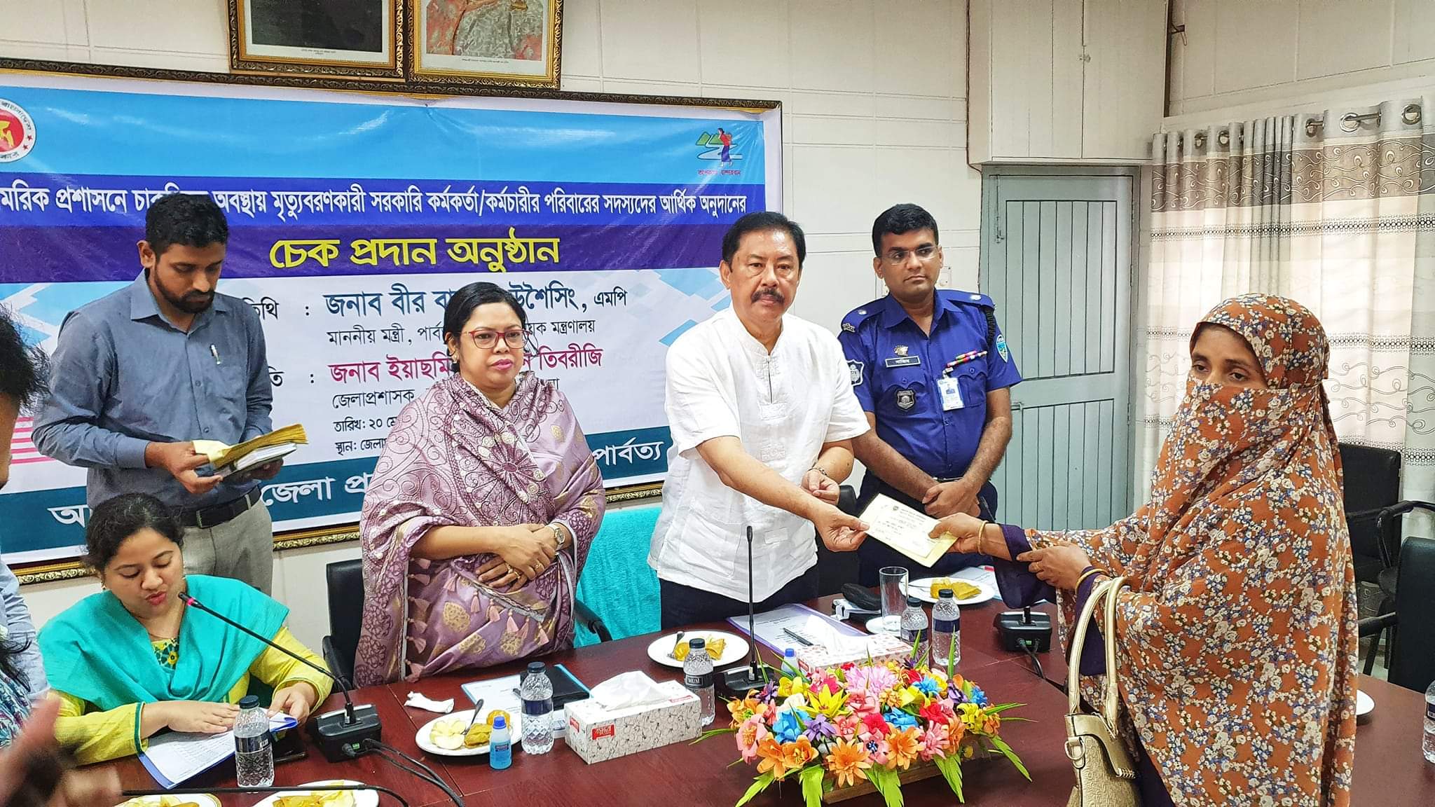 বাসুদেব বিশ্বাস ,বান্দরবান : বান্দরবানে বেসামরিক প্রশাসনে চাকরিরত অবস্থায় মৃত্যুবরণকারী সদস্য’র পরিবারের হাতে আর্থিক অনুদানের চেক বিতরণ করা হয়েছে।