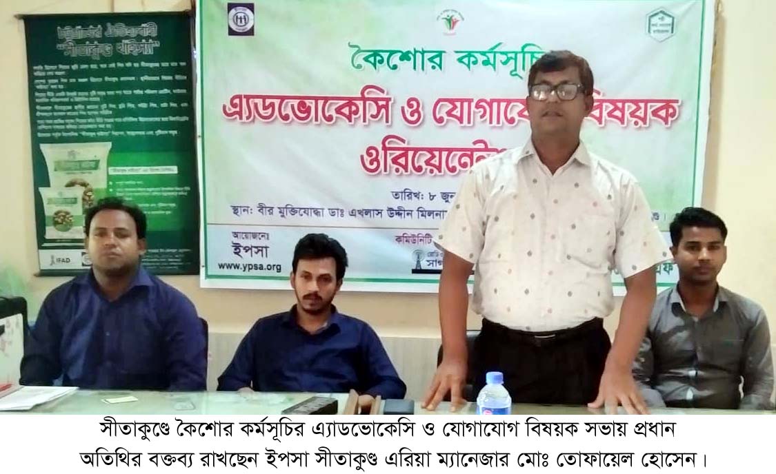 ইপসা কিশোর কর্মসূচির সিনিয়র প্রোগ্রাম অফিসার শিউলী রানী দেবীর পরিচালনায় অনুষ্ঠানে প্রধান অতিথি হিসেবে উপস্থিত ছিলেন, ইপসা’র সীতাকুণ্ড এরিয়ার ম্যানেজার মোঃ তোফায়েল হোসেন।