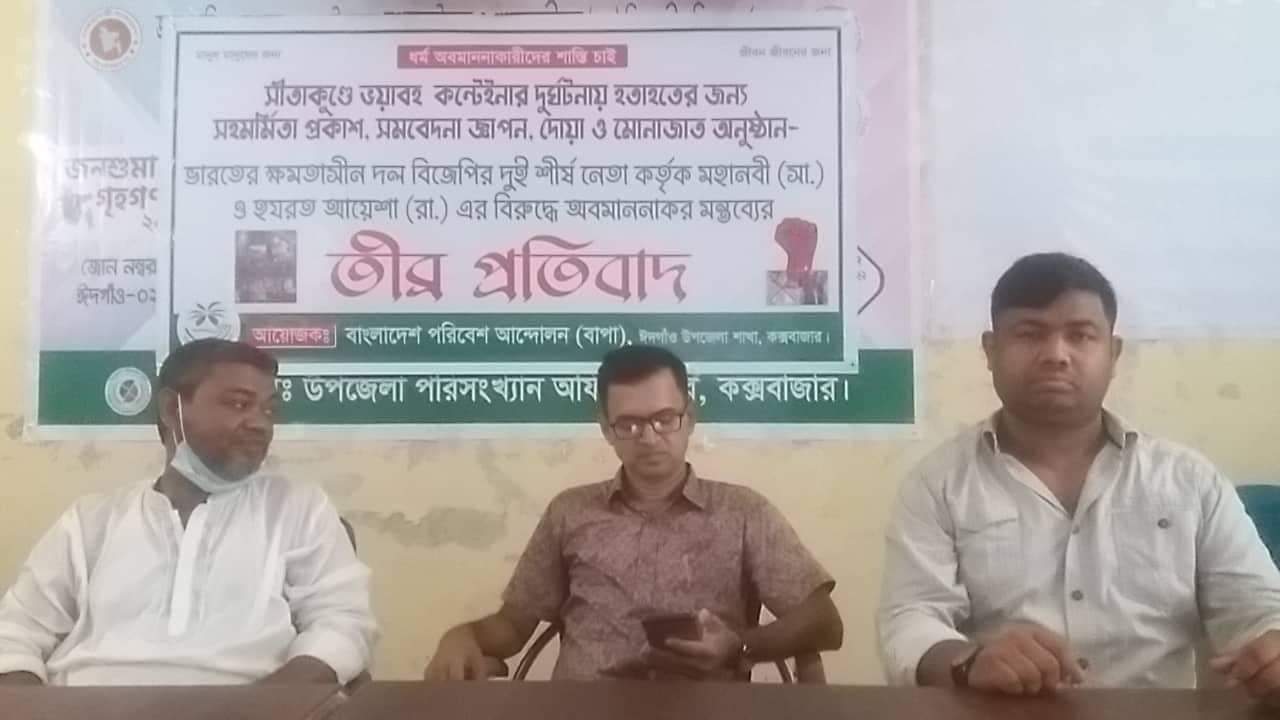 মোঃ রেজাউল করিম, ঈদগাঁও, কক্সবাজার :সীতাকুণ্ডে ভয়াবহ কন্টেইনার দুর্ঘটনায় হতাহতদের প্রতি ঈদগাঁওতে সহমর্মিতা প্রকাশ, সমবেদনা জ্ঞাপন, দোয়া ও মোনাজাত অনুষ্ঠিত হয়েছে। অন্যদিকে ভারতের ক্ষমতাসীন দল ভারতীয় জনতা পার্টি (বিজেপি)-র দুই শীর্ষ নেতা কর্তৃক মহানবী হযরত মুহাম্মদ (সঃ) ও হযরত আয়েশা (রাঃ) কে লক্ষ্য করে অবমাননাকর মন্তব্যের তীব্র প্রতিবাদ করা হয়েছে। বাংলাদেশ পরিবেশ আন্দোলন- বাপা ঈদগাঁও উপজেলা শাখা ১০ জুন শুক্রবার বিকেলে এ অনুষ্ঠানের আয়োজন করে। এতে সভাপতিত্ব করেন বাংলাদেশ পরিবেশ আন্দোলন ঈদগাঁও উপজেলা শাখার সভাপতি সাংবাদিক মোঃ রেজাউল করিম। বাপা ঈদগাঁও উপজেলা শাখার সাংগঠনিক সম্পাদক সাংবাদিক শেফাইল উদ্দিনের সঞ্চালনায় এ উপলক্ষে আয়োজিত সংক্ষিপ্ত অনুষ্ঠানে বক্তব্য রাখেন পরিবেশ আন্দোলন ঈদগাঁও উপজেলা শাখার সহ- কৃষি বিষয়ক সম্পাদক ব্যবসায়ী মাহমুদুল করিম গুননু, বদরখালী ডিগ্রী কলেজের প্রভাষক জাহেদুল হাসান, বৃহত্তর ঈদগাঁও সাংস্কৃতিক কেন্দ্রের সাধারণ সম্পাদক কুতুব উদ্দিন চৌধুরী ও রত্নগর্ভা রিজিয়া আহমদ নিম্ন মাধ্যমিক বিদ্যালয়ের শিক্ষক আবু বক্কর সিদ্দিক।