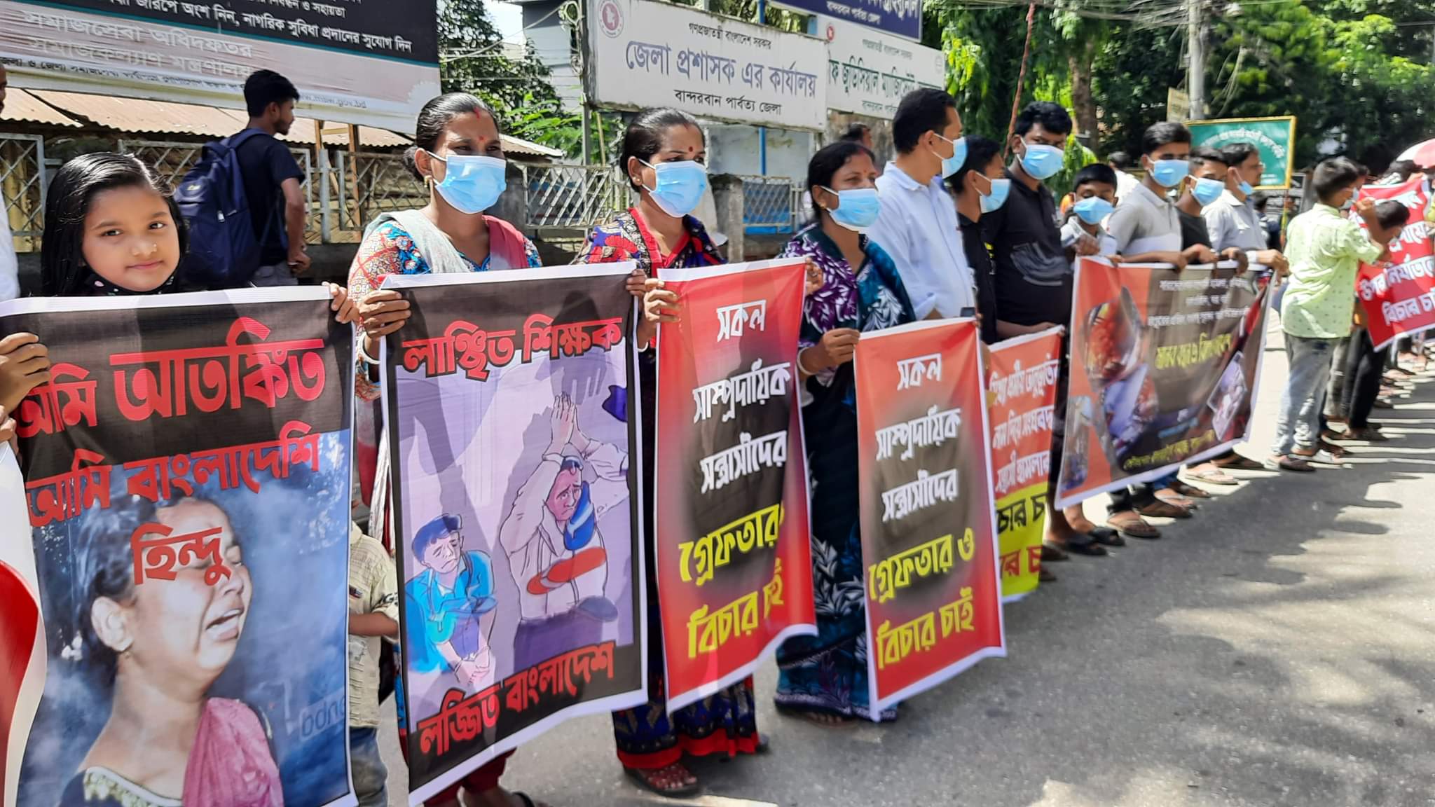 এসময় মানববন্ধনে ব্যানার ও প্ল্যাকার্ড হাতে নিয়ে সনাতনী সমাজের নারী পুরুষেরা অংশগ্রহণ করে এবং নড়াইল এর ঘটনার তীব্র প্রতিবাদ জানান।