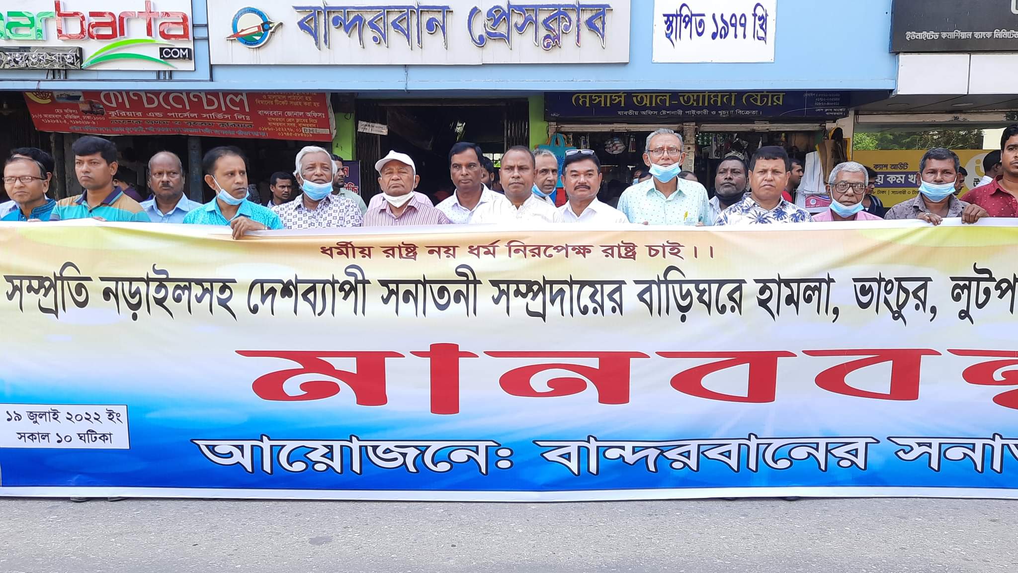 ১৯জুলাই (মঙ্গলবার) সকালে বান্দরবানের সনাতনী সমাজ এর আয়োজনে প্রেসক্লাবের সামনে ঘন্টাব্যাপী এই মানববন্ধন অনুষ্ঠিত হয়।