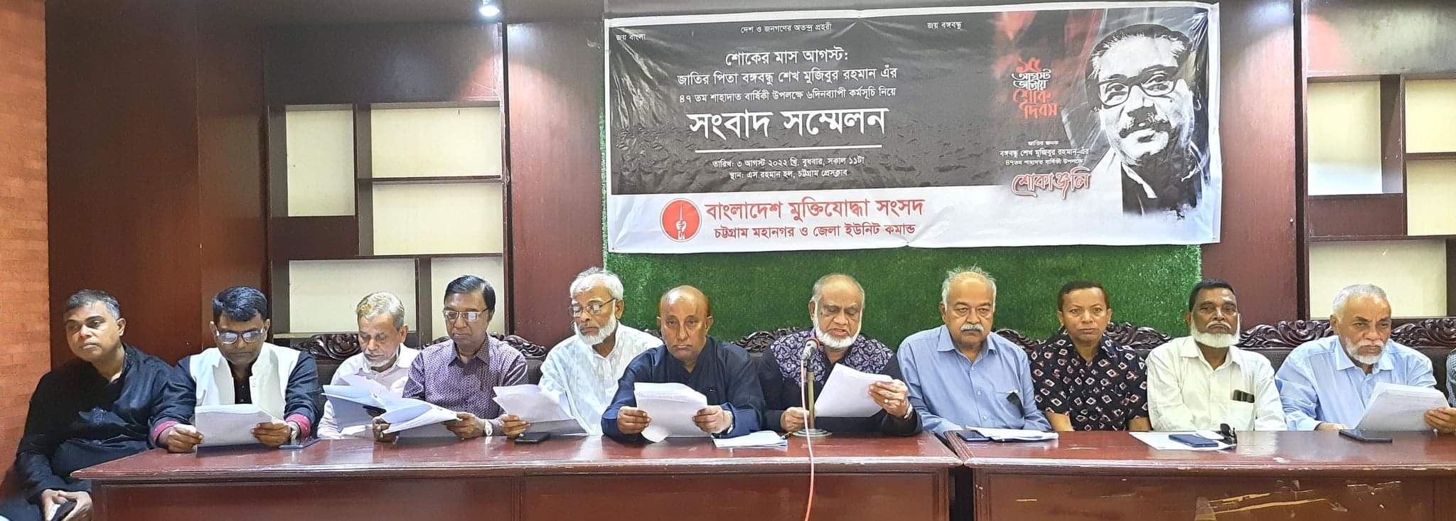 আলোচনা সভা ও আলোকচিত্র প্রদর্শনীসহ বিভিন্ন কর্মসূচীর আয়োজন করা হয়েছে। প্রতিদিন বিকেল ৩টা থেকে আলোচনা সভা শুরু হবে এবং সকাল ১০টা থেকে মুক্তিযুদ্ধ ভিত্তিক আলোকচিত্র প্রদর্শন করা হবে। এ উপলক্ষে আজ ৩ আগস্ট বুধবার সকাল ১১টায় চট্টগ্রাম প্রেসক্লাবের এস রহমান হলে সংবাদ সম্মেলনের আয়োজন করা হয়। সংবাদ সম্মেলনে মহানগর ইউনিট কমান্ডার বীর মুক্তিযোদ্ধা মোজাফফর আহাম্মদ ও জেলা ইউনিটের ভারপ্রাপ্ত কমান্ডার বীর মুক্তিযোদ্ধা একেএম সরওয়ার কামাল দুলুর পক্ষে লিখিত বক্তব্য পাঠ করেন সহকারী কমান্ডার বীর মুক্তিযোদ্ধা মোঃ আলাউদ্দিন। এ সময় উপস্থিত সাংবাদিকদের বিভিন্ন প্রশ্নের জবাব দেন বাংলাদেশ মুক্তিযোদ্ধা সংসদ চট্টগ্রাম মহানগর ইউনিট কমান্ডার বীর মুক্তিযোদ্ধা মোজাফফর আহাম্মদ ও জেলা ইউনিটের ভারপ্রাপ্ত কমান্ডার বীর মুক্তিযোদ্ধা একেএম সরওয়ার কামাল দুলু। উপস্থিত ছিলেন মহানগর ইউনিটের ডেপুটি কমান্ডার বীর মুক্তিযোদ্ধা শহীদুল হক চৌধুরী সৈয়দ, সহকারী কমান্ডার বীর মুক্তিযোদ্ধা সাধন চন্দ্র বিশ্বাস, জেলা ইউনিটের সহকারী কমান্ডার বীর মুক্তিযোদ্ধা মোঃ আবদুর রাজ্জাক, মোঃ বোরহান উদ্দিন, চট্টগ্রাম প্রেস ক্লাবের সাধারণ সম্পাদক চৌধুরী ফরিদ, পতেঙ্গা থানা কমান্ডার বীর মুক্তিযোদ্ধা মোঃ জাগির হোসেন, সাতকানিয়া থানা কমান্ডার বীর মুক্তিযোদ্ধা আবু তাহের এলএমজি, পটিয়া কমান্ডার বীর মুক্তিযোদ্ধা মোঃ মহিউদ্দিন, যুদ্ধকালীন কমান্ডার বীর মুক্তিযোদ্ধা মোঃ জাহেদ হোসেন, যুদ্ধকালীন কমান্ডার বীর মুক্তিযোদ্ধা তপন কান্তি দাশ, বীর মুক্তিযোদ্ধা মোঃ জামাল উদ্দিন, বীর মুক্তিযোদ্ধা দুলাল কান্তি দাশ, বীর মুক্তিযোদ্ধা তপন দস্তিদার, বীর মুক্তিযোদ্ধা নীল রতন দাশগুপ্ত, আলোকচিত্র সংগ্রাহক সাহাবউদ্দিন মজুমদার, মুক্তিযোদ্ধা সংসদ সন্তান কমান্ড কেন্দ্রীয় কমিটির সদস্য মোহাম্মদ সরওয়ার আলম চৌধুরী মনি, মহানগর কমিটির আহবায়ক সাহেদ মুরাদ সাকুসহ সর্বস্তরের বীর মুক্তিযোদ্ধা ও সন্তান কমান্ডের নেতৃবৃন্দ। সংবাদ সম্মেলনে জাতীয় শোক দিবস উপলক্ষে ৬ দিনের ঘোষনা করা হয়।