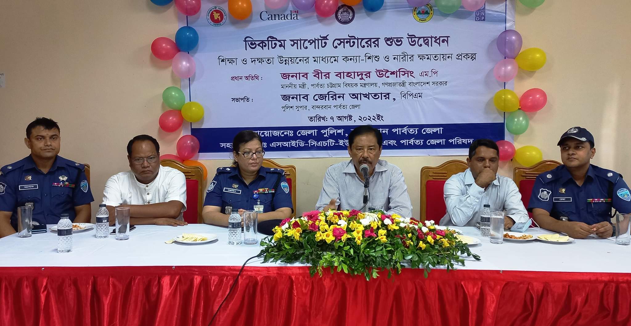 উদ্বোধনী অনুষ্ঠানে প্রধান অতিথির বক্তব্যে রাখতে গিয়ে পার্বত্য চট্টগ্রাম বিষয়ক মন্ত্রণালয়ের মন্ত্রী বীর বাহাদুর উশৈসিং এমপি বলেন, নির্যাতিত নারী ও শিশুরা এ সার্পোট সেন্টারের সহযোগিতা নিতে পারবেন। যারা অপরাধ করবে তাদের জন্য ভিকটিম সাপোর্ট সেন্টার আতঙ্কের বিষয়। নির্যাতনের শিকার নারী ও শিশুরা এ সেন্টারে সহযোগিতা পাবে। তিনি আরো বলেন, অনেক সময় ব্যস্ততা ও পারিপার্শ্বিক অবস্থার কারণে ক্ষতিগ্রস্থদের থানায় সহযোগিতা পেতে বিলম্ব হয়। সময়ক্ষেপনের কারণে মামলার গুরুত্বপূর্ণ আলামত নষ্ট হয়ে যায়। ফলে ক্ষতিগ্রস্থদের দুর্ভোগের শিকার হতে হয়। নারী ও শিশুদের এসব দুর্ভোগ অনেকাংশ লাঘব করবে এ ভিকটিম সাপোর্ট সেন্টার।