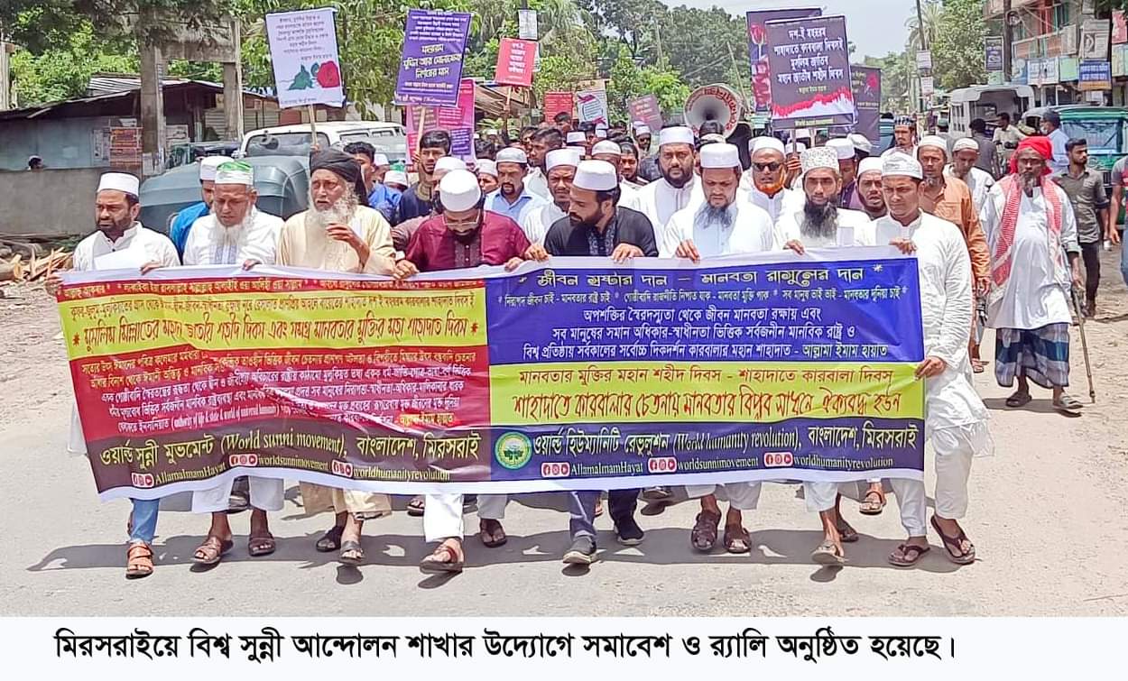 মিথ্যা-অবিচার-স্বৈরতার কবল থেকে সত্য ও মানবতার মুক্তি সাধনায় সর্বকালের সর্বোচ্চ মহা শাহাদাত, মুসলিম মিল্লাতের মহান জাতীয় শহীদ দিবস শাহাদাতে কারবালা দিবস উপলে বিশ্ব সুন্নী আন্দোলনের মিরসরাই উপজেলা শাখার উদ্যোগে বারইয়ারহাট পৌরসভার গার্লস হাই স্কুলে শুক্রবার (১২ আগস্ট) দুপুরে সমাবেশ ও শান্তিপূর্ণ র্যালি অনুষ্ঠিত হয়েছে।
