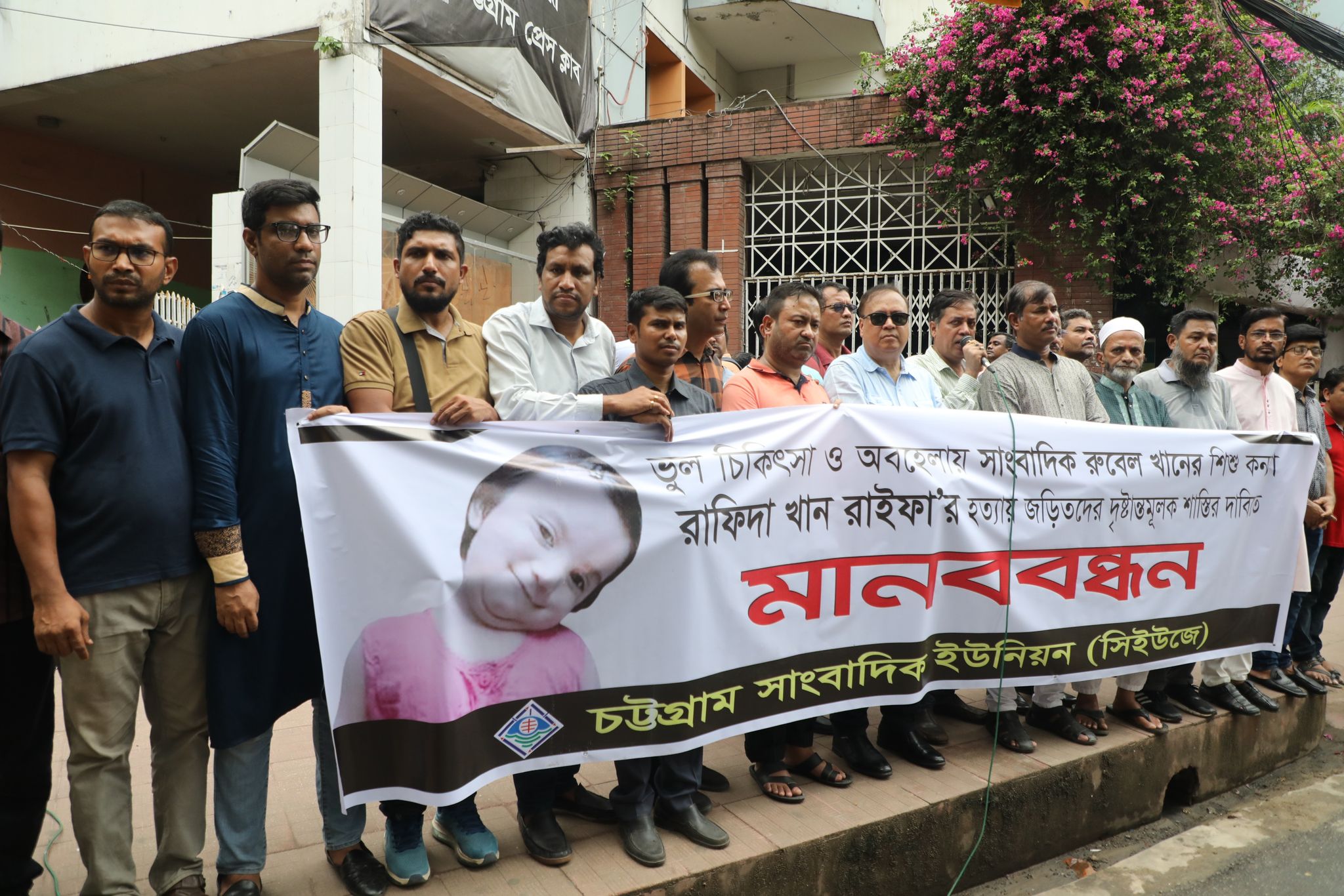 (সিইউজে) কার্যনির্বাহী কমিটির সিনিয়র সহ-সভাপতি মোহাম্মদ রুবেল খানের আড়াই বছরের শিশু কন্যা রাফিদা খান রাইফা হত্যা মামলার তদন্ত কার্যক্রম শেষ করে চার্জশিট প্রদানের জন্য এক মাসের আল্টিমেটাম দিয়েছে সিইউজে। সোমবার (২৬ জুন) দুপুরে চট্টগ্রাম প্রেস ক্লাবের সামনে অনুষ্ঠিত মানববন্ধন থেকে এ আল্টিমেটাম দেন সাংবাদিক নেতারা। মামলা দায়ের হওয়ার পাঁচ বছরেও তদন্ত শেষ না হওয়ার তদন্তকারী সংস্থার ভূমিকার সমালোচনা করে নেতারা বলেন, শুরু থেকেই মামলা নিয়ে নানা তালবাহানা করে আসছে পুলিশ। পরবর্তীতে থানা পুলিশ থেকে মামলাটি পিবিআইতে যাবার পর প্রায় দুই বছর অতিবাহিত হলেও এখনো তদন্ত শেষ না হওয়া দুঃখজনক। সিইউজে সভাপতি তপন চক্রবর্তীর সভাপতিত্বে বিক্ষোভ সমাবেশে বক্তব্য দেন সিইউজের সাধারণ সম্পাদক ম. শামসুল ইসলাম, সাবেক সভাপতি মোস্তাক আহমদ, চট্টগ্রাম প্রেস ক্লাবের সাধারণ সম্পাদক দেবদুলাল ভৌমিক, সিইউজের সিনিয়র সহসভাপতি মোহাম্মদ রুবেল খান, সহ-সভাপতি অনিন্দ্য টিটো, চট্টগ্রাম নাগরিক ফোরামের সভাপতি ব্যারিস্টার মনোয়ার হোসেন, বাংলাদেশ ফেডারেল সাংবাদিক ইউনিয়নের যুগ্ম-মহাসচিব মহসিন কাজী, নির্বাহী সদস্য আজহার মাহমুদ, সিইউজের অর্থ সম্পাদক মো. মুজাহিদুল ইসলাম, সাংগঠনিক সম্পাদক মহরম হোসাইন, সাবেক যুগ্ম-সম্পাদক সবুর শুভ, প্রচার ও প্রকাশনা সম্পাদক সরওয়ার কামাল, নির্বাহী সদস্য আলাউদ্দিন হোসেন দুলাল, প্রতিনিধি ইউনিট প্রধান (ভারপ্রাপ্ত) সোহেল সরওয়ার, আমাদের সময়ের ব্যুরো প্রধান হামিদ উল্লাহ। মানববন্ধনে উপস্থিত ছিলেন দৈনিক পূর্বদেশ ইউনিটের প্রধান জীবক বড়ুয়া, সিইউজের সাবেক অর্থ সম্পাদক উজ্জল ধর ও কাশেম শাহ, চট্টগ্রাম প্রেস ক্লাবের সমাজসেবা ও আপ্যায়ন সম্পাদক আল রাহমান, প্রচার ও প্রকাশনা সম্পাদক খোরশেদুল আলম শামীম, নির্বাহী সদস্য আইয়ুব আলী, চট্টগ্রাম ফটো জার্নালিস্ট এসোসিয়েশনের সাধারণ সম্পাদক রাজেশ চক্রবর্তী, সিইউজের সদস্য মাহবুবুর রহমান, প্রদীপ নন্দী, নুর উদ্দীন, ই পারভেজ ফারুকী, নিপুল কুমার দে, ওমর ফারুক, গোলাম মর্ত্তুজা আলী, কাঁকন দেব, সুজন ঘোষ, সৌরভ দাশ, কাজী মনজুরুল ইসলাম, মিজানুর রহমান ইউসুফ, প্রীতম দাশ, বিশ্বজিৎ পাল, চম্পক চক্রবর্তী, ইকবাল হোসেন, এফএম মিজানুর রহমান, হাসান আলী, বাসু দেব, আহসান হাবিবুল আলম, আবদুল হান্নান কাজল, অনুপম বড়ুয়া, কমল দাশ, রুমন ভট্টাচার্য, মিনহাজুল ইসলাম, ইমরান এমি, আকমাল হোসেন, মোরশেদ হোসেন চৌধুরী, বাচ্চু বড়ুয়া, আবুল হোসাইন মো. কাউসার, মো. শহীদুল ইসলাম সুমন, আশরাফুল ইসলাম রবি, আবদুল্লাহ হামিদ রাকীব, আসহাব উদ্দিন, মো. আবু জাবেদ, মুহাম্মদ আবু তৈয়ব (তৈয়ব সুমন), মো. শাহাদাৎ হোসেন চৌধুরী, নাজিম উদ্দিন, মো. মিজানুর রহমান, মো. জিগারুল ইসলাম, মর