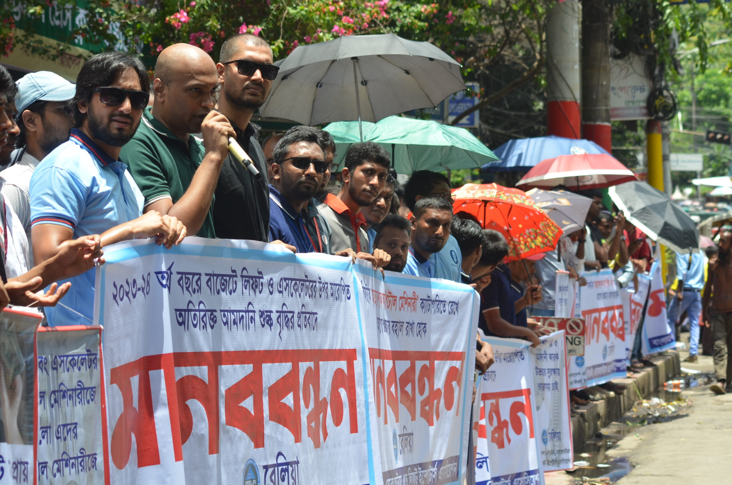 লিফট ও এসকেলেটর আমদানিতে অতিরিক্ত শুল্ক প্রত্যাহারের দাবিতে মানবন্ধন করেছে ‘বাংলাদেশ এলিভেটর এসকেলেটর অ্যান্ড লিফট ইমপোর্টার্স অ্যাসোসিয়েশনের (বেলিয়া)। চট্রগ্রাম প্রেস ক্লাবের সামনে আয়োজিত মানবন্ধনে ‘২০২৩-২৪ অর্থবছরে লিফট ও এসকেলেটরের ওপর থেকে অতিরিক্ত শুল্ক প্রত্যাহারের দাবি জানান এ খাত সংশ্লিষ্টরা। মানববন্ধনে বলা হয়, করোনা-পরবর্তী ২০২২-২৩ অর্থবছরে বিশ্বব্যাপী যুদ্ধবিগ্রহ, মূল্যস্ফীতি, মন্দা, বিভিন্ন দেশে মুদ্রার অবমূল্যায়ন ইত্যাদি কারণে লিফট সরবরাহকারী প্রতিষ্ঠানগুলো চরম আর্থিক ক্ষতির সম্মুখীন হয়। তারপরও গত অর্থবছরে লিফটের ওপরে ৫ শতাংশ শুল্ক বৃদ্ধির করা হয়। এতে আমাদানিকাররা আরও বেগতিক অবস্থায় পড়েছেন। গত অর্থবছরে লিফটকে ক্যাপিটাল মেশিনারিজ থেকেও অব্যাহতি দেওয়া হয়। এছাড়াও বক্তারা বলেন, বাজেটে অতিরিক্ত শুল্ক যেন মরার ওপর খাঁড়ার ঘা। এ শিল্পের সুরক্ষার্থে গত বৎসরের কার্যাদেশের ওপর পূর্বের বাজেটের নিয়মানুযায়ী শুল্ক/কর বহাল রাখতে সরকারের সুবিবেচনার জন্য অনুরোধ করছি। মানববন্ধন থেকে দাবি করা হয়, মানববাহনের লিফটের আন্তর্জাতিক মানদণ্ডে বাংলাদেশে লিফট স্ট্যান্ডার্ড প্রনয়ন ও নিয়ন্ত্রক সংস্থা গঠন করা এখন সময়ের দাবি। বেলিয়া সরকারের সঙ্গে একযোগে এ আমদানি নির্ভর সেক্টরের বিকল্পপন্থা উদ্ভাবন, সেফটি এবং স্ট্যান্ডার্ড নীতিমাল্য প্রনয়ণ, নিয়ন্ত্রক সংস্থা প্রণয়ন ইত্যাদি কার্যকরী ব্যবস্থা গ্রহণে একযোগে কাজ করতে বদ্ধপরিকর। মানববন্ধনে সংগঠনের সহ-সভাপতি আকতার জামিল ভূঁইয়া, সাইফুল ইসলাম, অচিন্ত কুমার বিশ্বাস, বাংলাদেশ এলিভেটর এসকেলেটর অ্যান্ড লিফট ইমপোর্টার্স অ্যাসোসিয়েশনের সভাপতি এমদাদ উর রহামান এবং সাধারণ সম্পাদক মো. শফিউল আলম উজ্জ্বল, ইউনাইটেড এক্সপাটিজ বিডি লিমিটেড এর ম্যানেজিং ডিরেক্টর পুজন সেন গুপ্ত, ও টু এলিভেটর কোম্পানি লিমিটেড এর ম্যানেজিং ডিরেক্টর মোহাম্মদ ইউসুফ নবী, চিটাগং পাওয়ার এর সিইও মিনহাজ মাহবুবমানববন্ধনে সংগঠনের সহ-সভাপতি আকতার জামিল ভূঁইয়া, সাইফুল ইসলাম, অচিন্ত কুমার বিশ্বাসসহ প্রায় দুই শতাবধি সদস্য মানববন্ধনে উপস্থিত ছিলেন।