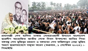 বঙ্গবন্ধু শেখ মুজিবুর রহমান ও বঙ্গামাতা শেখ ফজিলাতুন্নেছা মুজিব স্মরণে ছাত্রসমাবেশের আয়োজন করা হয়েছে। সমাবেশ শুরুর আগে তাদের সম্মানে এক মিনিট নীরবতা পালন করা হয়।