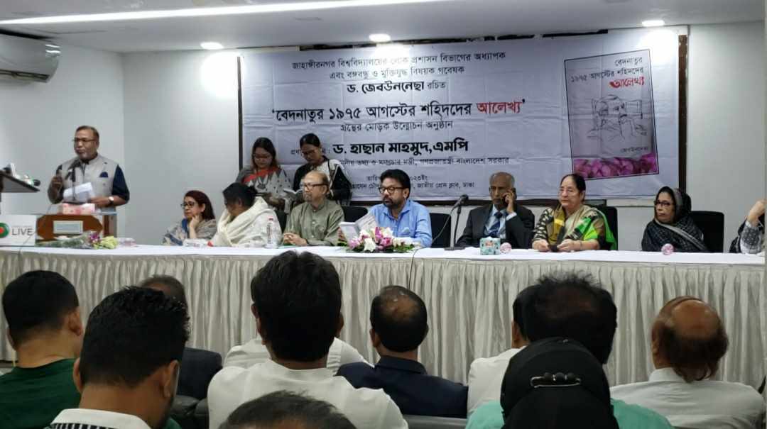 জাহাঙ্গীরনগর বিশ্ববিদ্যালয়ের লোক প্রশাসন বিভাগের অধ্যাপক বঙ্গবন্ধু ও মুক্তিযুদ্ধ বিষয়ক গবেষক ড. জেবউননেছা রচিত "বেদনাতুর ১৯৭৫ আগষ্ঠের শহিদদের আলেখ্য" গ্রন্থের মোড়ক উন্মোচন করা হয়েছে।