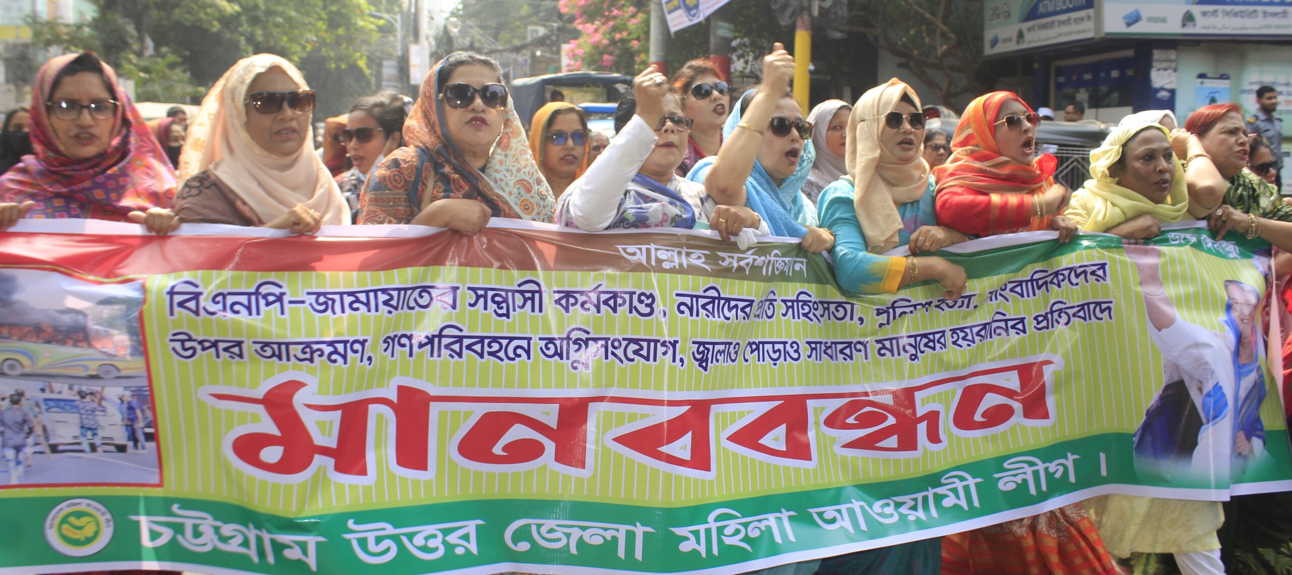 বিএনপি - জামাতের সন্ত্রাসী কর্মকান্ড, নারীদের প্রতি সহিংসতা, সাংবাদিকদের উপর আক্রমণ, পুলিশ হত্যা . গণপরিবহনে অগ্নিসংযোগ, জ্বালাও পোড়াও, সাধারণ মানুষের হয়রানির প্রতিবাদে মানববন্ধন ও বিক্ষোভ মিছিল করে চট্টগ্রাম উত্তর জেলা মহিলা আওয়ামী লীগ আজ ৮ নভেম্বর সকাল ১১ টায় চট্টগ্রাম প্রেস ক্লাব চত্বরে।