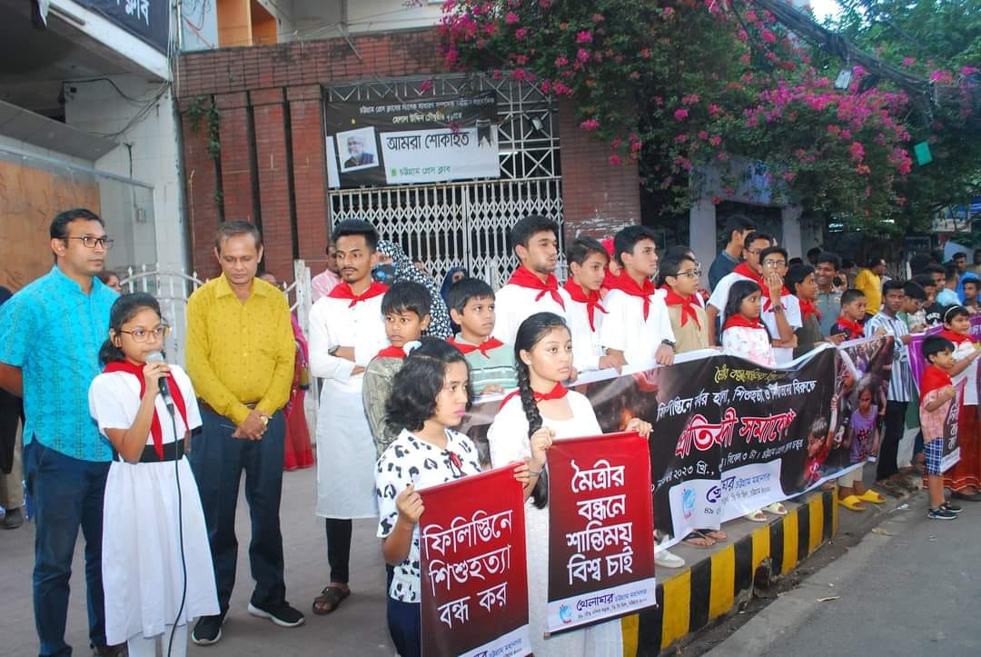 ইসরায়েলের বোমা হামলায় ফিলিস্তিনের শিশু এবং গণহত্যার প্রতিবাদে আয়োজিত এই কর্মসূচিতে জাতীয় শিশু-কিশোর সংগঠন খেলাঘরের শিশু-কিশোরেরা অংশগ্রহণ করে। শিশু-কিশোররা ইসরায়েলের নৃশংসতা-বর্বরতা প্রতিবাদ জানিয়ে অবিলম্বে যুদ্ধ বন্ধের দাবি জানায়।